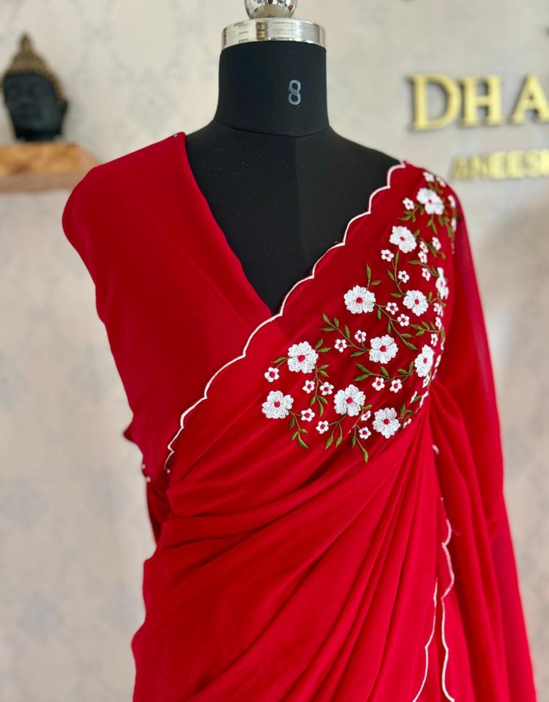 This stunning red saree captures the essence of graceful sophistication with its soft drape and delicately scalloped border. Crafted from premium georgette, it flows effortlessly while maintaining an elegant structure. The blouse stands out with exquisite hand-embroidered floral motifs in white, adding a refreshing contrast and timeless charm to the bold red fabric.