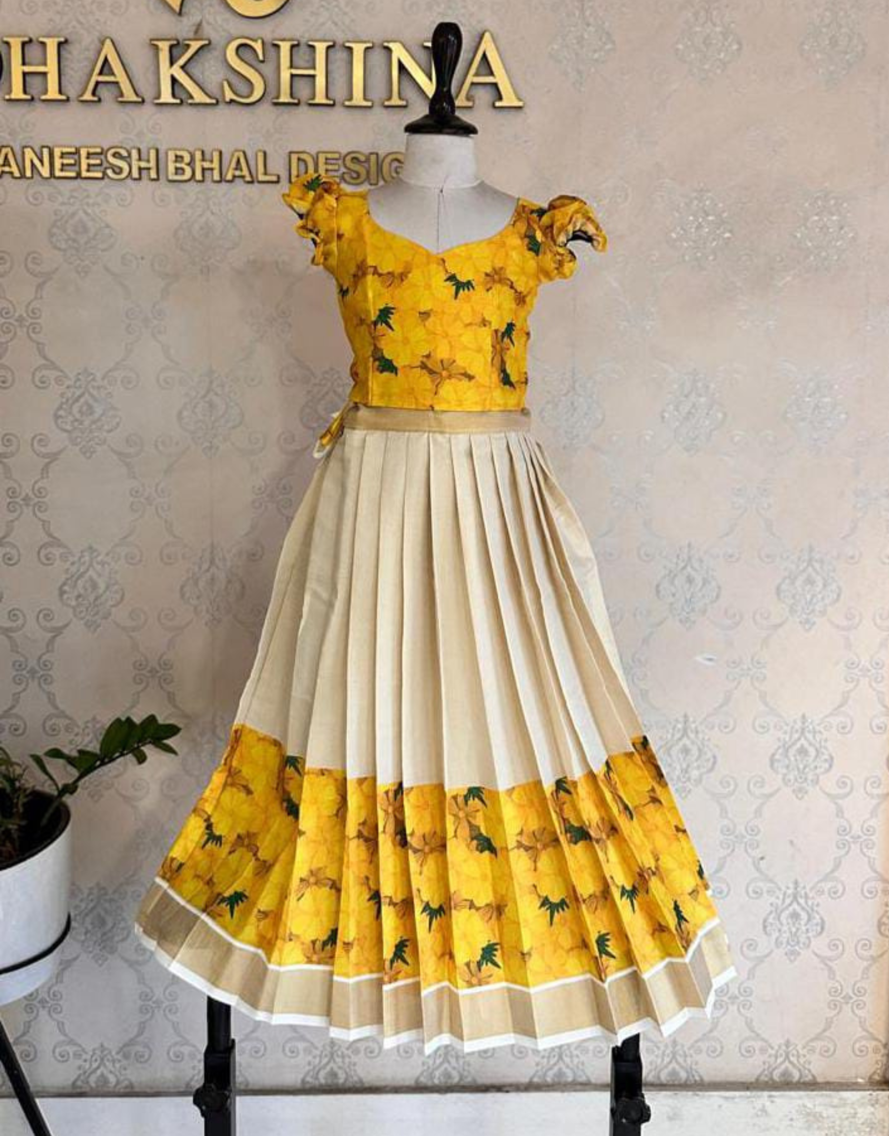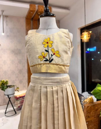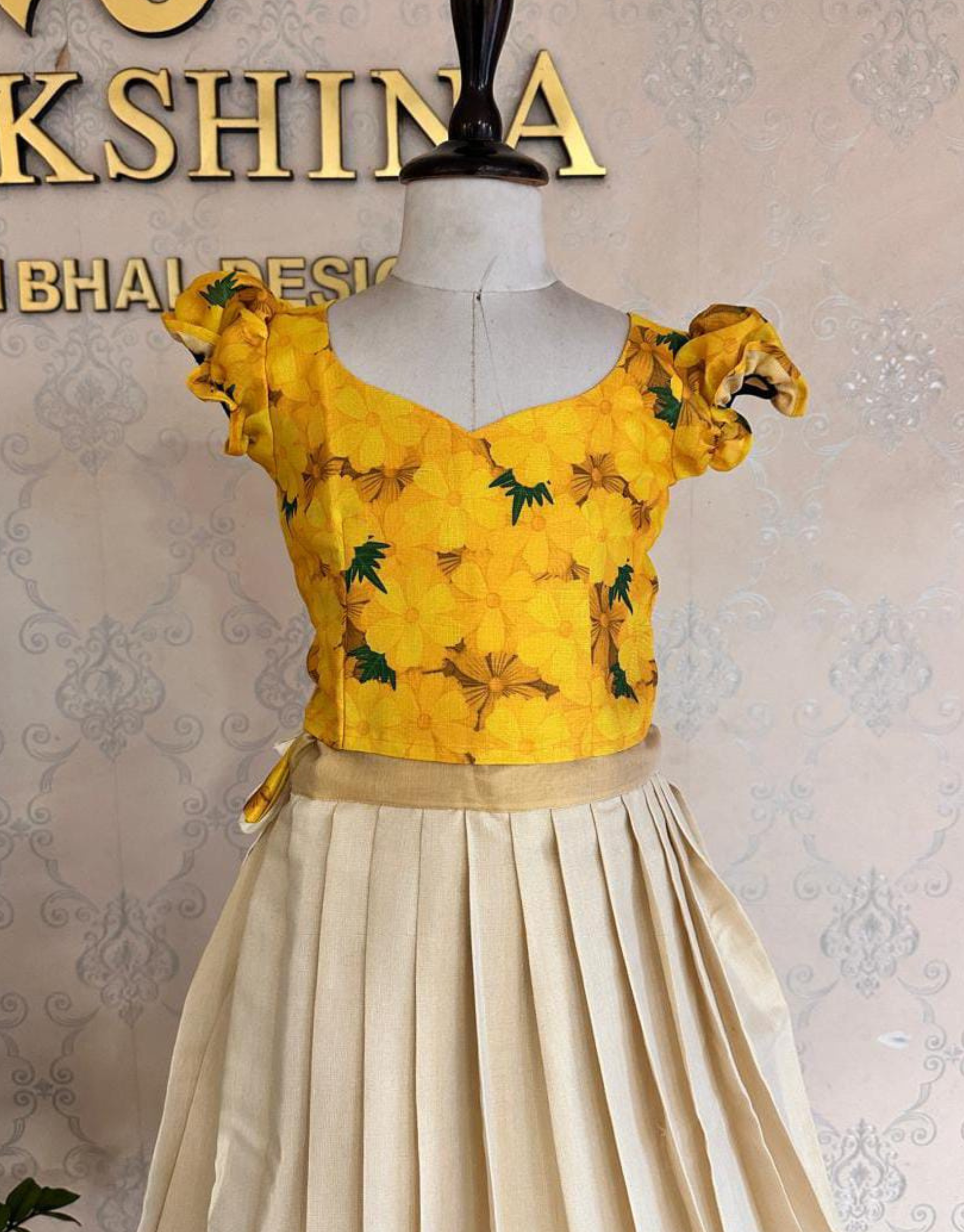 - Contrasting ivory pleated skirt with golden motifs